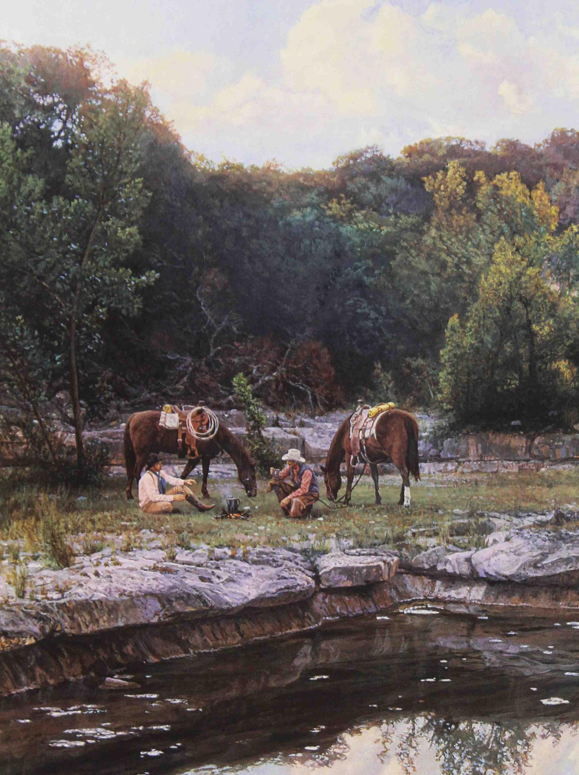 Start your day on the open range with Cowboy Coffee by Bob Wygant. This classic western art print captures a group of cowboys gathered around the campfire, savoring a moment of camaraderie and warmth before the day’s work begins. Perfect for collectors of cowboy art, western artwork, and rustic western wall art, Wygant’s detailed style evokes the timeless traditions and rugged lifestyle of the American West. Ideal for ranch-inspired homes, studies, or living rooms, Cowboy Coffee brings the spirit of western heritage to any space as a must-have western art print.